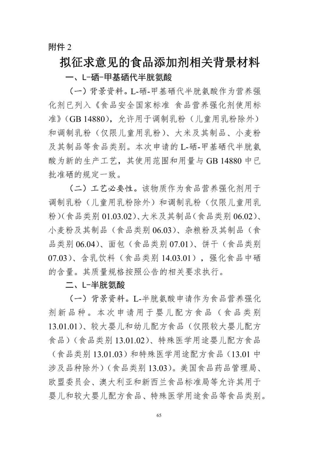 根據(jù)《食品添加劑新品種管理辦法》和《食品添加劑新品種申報(bào)與受理規(guī)定》,L-硒-甲基硒代半胱氨酸等11種食品營(yíng)養(yǎng)強(qiáng)化劑新品種、富馬酸和乙酸鈉2種擴(kuò)大使用范圍的食品添加劑的申請(qǐng),其安全性和工藝必要性已通過(guò)專(zhuān)家評(píng)審委員會(huì)技術(shù)審查(具體情況見(jiàn)附件),現(xiàn)公開(kāi)征求意見(jiàn)。請(qǐng)于2022年9月16日前將相關(guān)意見(jiàn)反饋至我中心郵箱(zqyj@cfsa.net.cn),逾期將視為無(wú)意見(jiàn)。