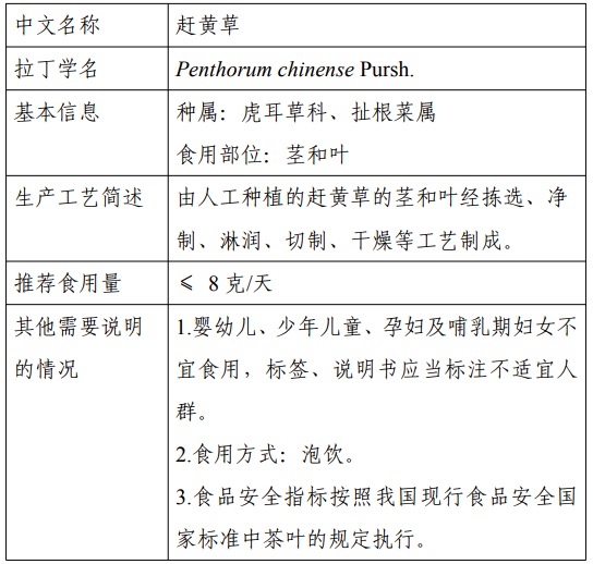 趕黃草是由人工種植的趕黃草地上部分的全株經(jīng)揀選、凈制、淋潤、切制、干燥等工藝制成。趕黃草于2016年申報(bào)新食品原料,2020年6月,國家衛(wèi)生健康委員發(fā)布《關(guān)于瑞士乳桿菌R0052等53種“三新食品”的公告(2020年第4號(hào))》,正式批準(zhǔn)趕黃草為新食品原料。