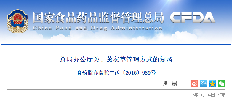 你局《關于明確薰衣草管理方式的請示》(冀食藥監(jiān)〔2016〕51號)收悉。經(jīng)商農(nóng)業(yè)部和衛(wèi)生計生委,現(xiàn)函復如下: