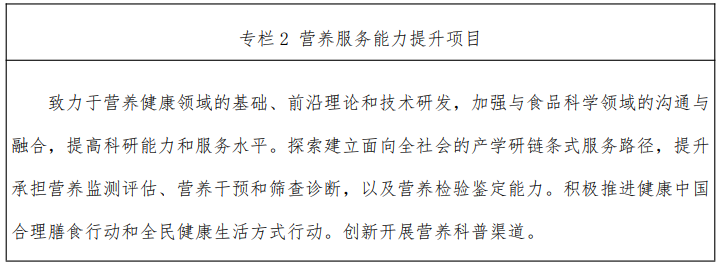 1.順應(yīng)合理膳食需要,強(qiáng)化營養(yǎng)工作基礎(chǔ)。持續(xù)開展食物成分監(jiān)測,建立中國居民的食物成分、人群營養(yǎng)健康、食品標(biāo)簽等相關(guān)的數(shù)據(jù)庫,構(gòu)建全國油、鹽和肥胖率等營養(yǎng)健 康評價指標(biāo)分級地圖并推動屬地應(yīng)用,推動“減鹽、減油、減 糖”的“減”目標(biāo)與新一代營養(yǎng)健康食品的“加”效應(yīng)形成雙輪 驅(qū)動格局,提升消費者科學(xué)認(rèn)知,促進(jìn)平衡膳食。積極推動在食品包裝上使用“包裝正面標(biāo)識”(FOP)信息,強(qiáng)化預(yù)包裝食品營養(yǎng)標(biāo)簽標(biāo)準(zhǔn)的宣貫與實施。制定營養(yǎng)素及營養(yǎng)相關(guān)物質(zhì)風(fēng)險評估技術(shù)指南,為營養(yǎng)干預(yù)策略和營養(yǎng)標(biāo)準(zhǔn)制定提供科學(xué)支撐,推動食品、營養(yǎng)、醫(yī)學(xué)等多學(xué)科交叉創(chuàng)新型人才培養(yǎng),鍛造更多復(fù)合型專業(yè)人才。構(gòu)建營養(yǎng)風(fēng)險受益評估模型,開展?fàn)I養(yǎng)素及相關(guān)標(biāo)準(zhǔn)的“風(fēng)險—收益”、“成本—效 益”分析評估,建立基于中國人群數(shù)據(jù)的營養(yǎng)特膳標(biāo)準(zhǔn)評價模型。
