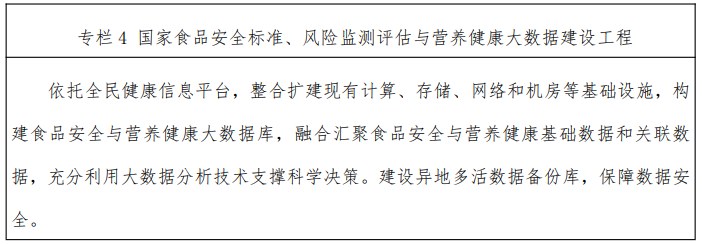 3.發(fā)揮數(shù)字技術(shù)引領(lǐng)創(chuàng)新作用,統(tǒng)籌推進(jìn)食品安全標(biāo)準(zhǔn)與監(jiān)測評估、營養(yǎng)健康管理信息化建設(shè)。依托全民健康信息平臺,構(gòu)建食品安全與營養(yǎng)健康大數(shù)據(jù)庫。建設(shè)國家食品安 全與營養(yǎng)健康大數(shù)據(jù)平臺,融合匯聚食品安全與營養(yǎng)健康基礎(chǔ)數(shù)據(jù)和關(guān)聯(lián)數(shù)據(jù),充分利用大數(shù)據(jù)分析技術(shù)支撐科學(xué)決策。積極推動大數(shù)據(jù)、人工智能、區(qū)塊鏈等數(shù)字技術(shù)與食品安全與營養(yǎng)健康深度融合的關(guān)鍵技術(shù)研究。建立食品安全與營養(yǎng)健康一體化、協(xié)同化共享互通的信息技術(shù)標(biāo)準(zhǔn)規(guī)范和信息資源目錄。鼓勵各省建設(shè)有自身業(yè)務(wù)特色的食品安全與營養(yǎng)健康信息平臺,積極推進(jìn)“國家—省”兩級平臺、“國家—省—市—縣”四級網(wǎng)絡(luò)體系建設(shè),健全網(wǎng)絡(luò)和數(shù)據(jù)安全防護(hù)體系。