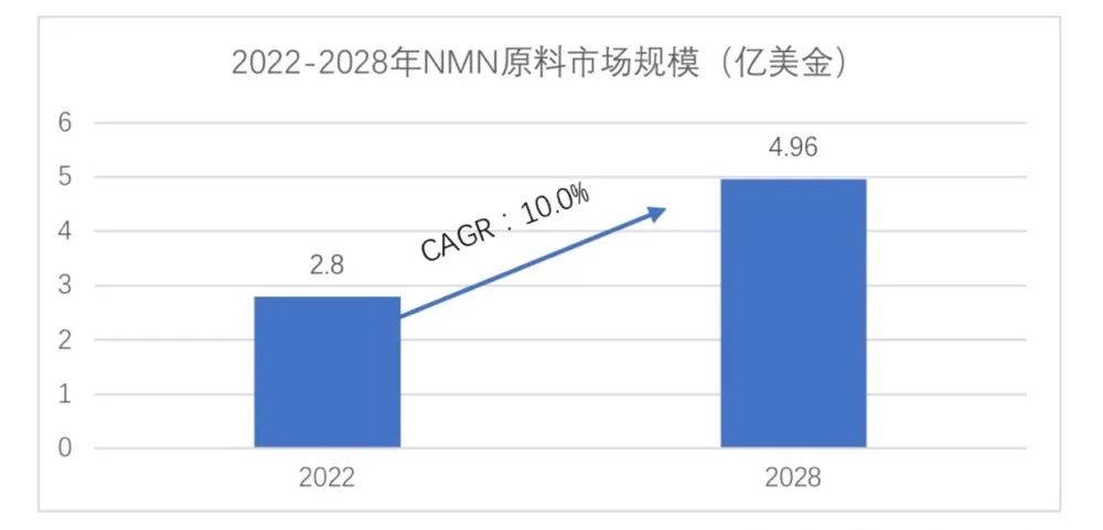 美國的市場研究公司(GlobeNewswire)的數(shù)據(jù)顯示,2022年全球NMN的原料市場銷售額預估為2.8億美金,其預測到2028年,NMN的原料銷售額將達到4.96億美金,年復合增長率達到10.0%[1]。主要的供應商包括基因港(GeneHarbor)、霍伯麥(Herbalmax)、日本新和制藥(Shinkowa)和音芙醫(yī)藥(EffePharm)。四家的原料合計占比達到了83%的市場占有率。