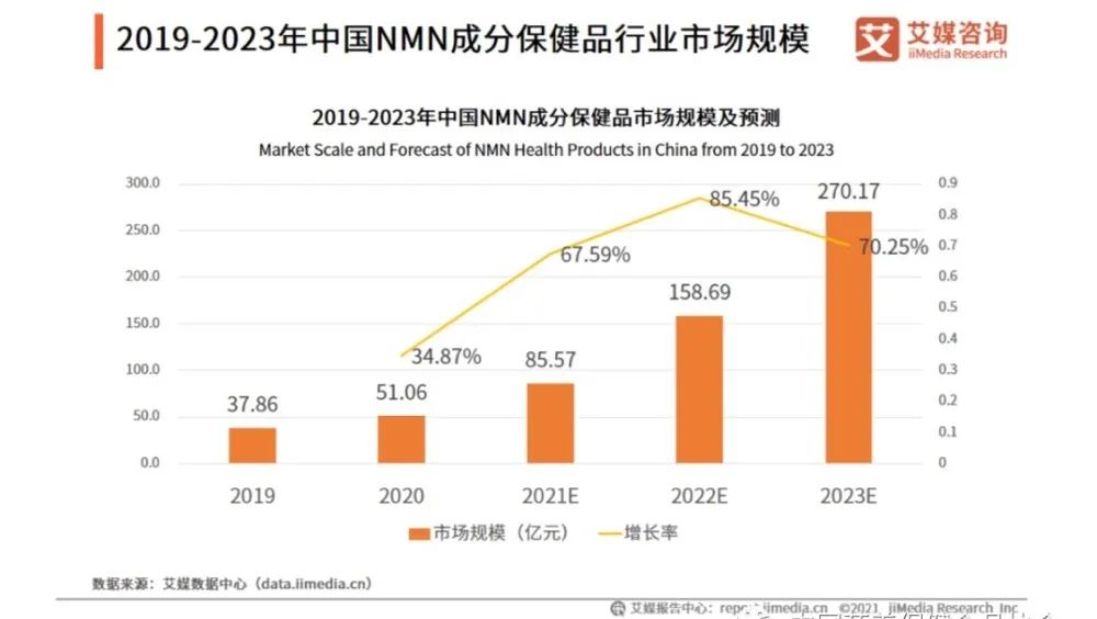 中國作為NMN的最大消費市場,依據(jù)艾媒數(shù)據(jù)中心數(shù)據(jù),2020年含NMN成分食品的市場規(guī)模達51.06億元,同比增長34.87%,預計到2023年將會以近70.25%的增速攀升至270.13億元,行業(yè)發(fā)展速度較快[2]。市場規(guī)模和增長率如下圖所示。
