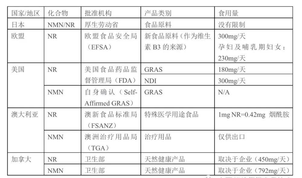 從中可以看出,NR在歐盟、美國、日本都基本批準作為食品原料,其相當于維生素B3(煙酸)的一個來源。NMN在日本、美國作為食品原料進行管理。NMN/NR在加拿大都是作為天然健康產(chǎn)品進行管理。
