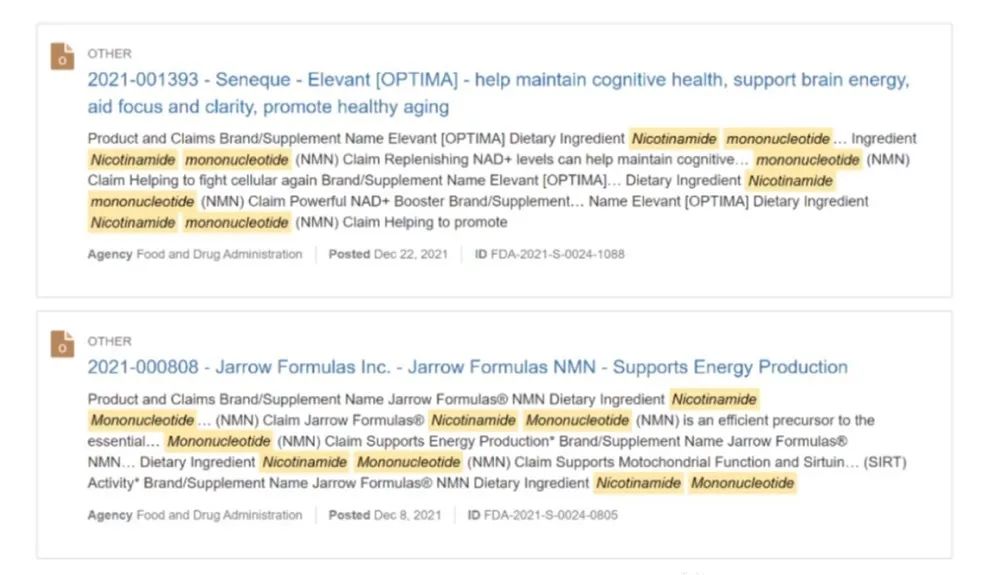 我們也看到了美國上市的NMN產(chǎn)品有很多,這可以從美國FDA關(guān)于結(jié)構(gòu)/功能聲稱的申請文件中看出,如下圖所示[7]。