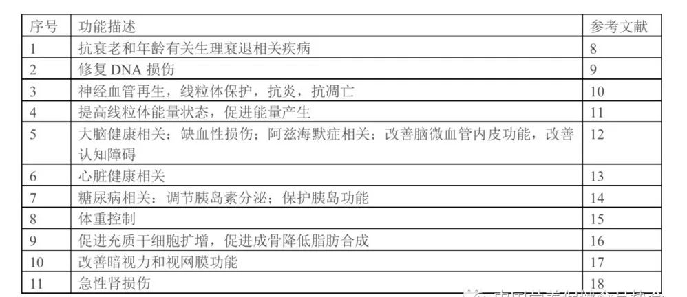 近幾年,有關(guān)NMN生物學功能的研究日益增加[8,9-18],如:改善與年齡有關(guān)的病理生理和疾病狀況,明顯減輕與年齡相關(guān)的生理衰退,改善細胞能量狀態(tài)、神經(jīng)系統(tǒng)、大腦認知(阿茲海默)等,并對心臟病、糖尿病等諸多疾病情況的改善顯示出良好效果。整理如下表所示。