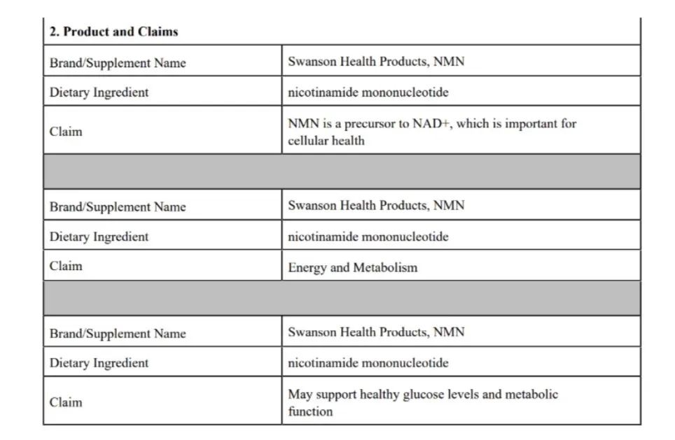 我們下載了一個美國FDA中Swanson Health Products, NMN的結(jié)構(gòu)/功能申請[19],截圖如下: