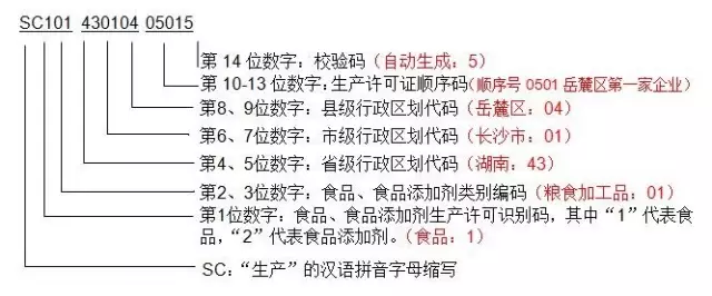 一、食品生產(chǎn)許可證編號(hào)由SC(“生產(chǎn)”的漢語(yǔ)拼音字母縮寫)和14位阿拉伯?dāng)?shù)字組成。數(shù)字從左至右依次為:3位食品類別編碼、2位省(自治區(qū)、直轄市)代碼、2位市(地)代碼、2位縣(區(qū))代碼、4位順序碼、1位校驗(yàn)碼。