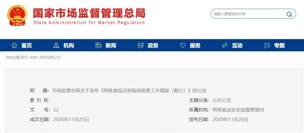 為規(guī)范特殊食品注冊現(xiàn)場核查工作,依據(jù)《中華人民共和國食品安全法》《保健食品注冊與備案管理辦法》《嬰幼兒配方乳粉產(chǎn)品配方注冊管理辦法》《特殊醫(yī)學(xué)用途配方食品注冊管理辦法》等法律規(guī)章,市場監(jiān)管總局制定了《特殊食品注冊現(xiàn)場核查工作規(guī)程(暫行)》,現(xiàn)予發(fā)布,自公布之日起施行。