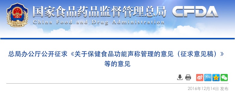 為全面貫徹落實新修訂的《中華人民共和國食品安全法》,進一步規(guī)范保健食品功能聲稱,保障消費者權益,食品藥品監(jiān)管總局研究起草了《關于保健食品功能聲稱管理的意見》(征求意見稿)以及緩解視疲勞、增強免疫力、抗氧化等3個保健功能的名稱及釋義(征求意見稿),現(xiàn)公開征求修改意見和建議。請社會各界積極參與研究并于2016年12月30日前將相關意見和建議反饋我局。