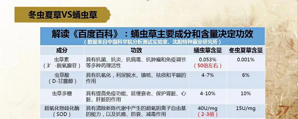 ■ 蟲(chóng)草酸:具有預(yù)防治療腦血栓、腦溢血、腎功能衰竭以及利尿的作用。