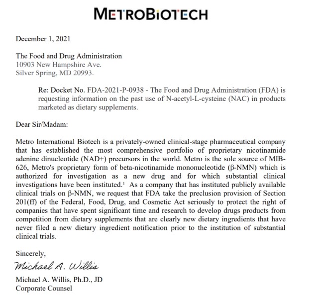 2021年12月1日,制藥公司MetroBiotech就給美國(guó)FDA寫(xiě)信,大致內(nèi)容是公司獨(dú)立研發(fā)的MIB-626是一種“NMN衍生分子”,已經(jīng)被授權(quán)作為新型藥物進(jìn)入了臨床階段,希望FDA認(rèn)真對(duì)待聯(lián)邦食品、藥品和化妝品法第201(ff)條的排除條款,下架作為膳食補(bǔ)充劑上市但卻沒(méi)申請(qǐng)新NDI的NMN產(chǎn)品,從而保護(hù)那些花費(fèi)時(shí)間和資源在開(kāi)發(fā)藥品的公司權(quán)利。