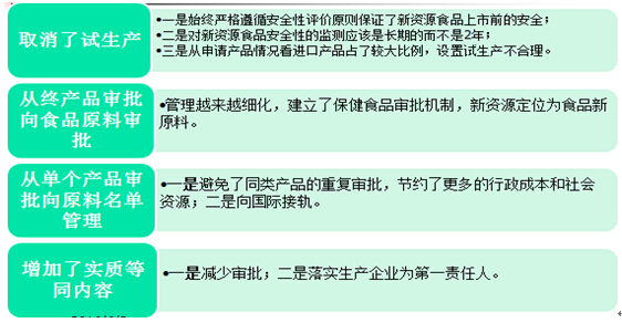 釋義:一是將食品加工過程中使用的微生物新品種納入第一類管理,二是增加了合成類等其他新研制食品原料。